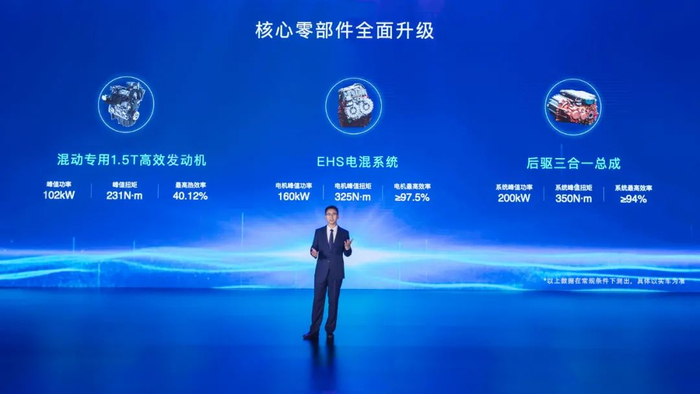 核心零部件混动专用1.5T高效发动机、EHS电混系统均实现全面升级。同时全新开发后驱三合一总成,系统高度集成,整车动力大幅提升。