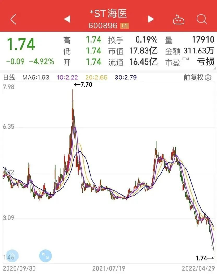 二级市场方面,*ST海医已连续多个交易日股价跌停,截至最新收盘日,公司股价报1.74元/股,总市值为17.83亿元。(北京商报记者 马换换)