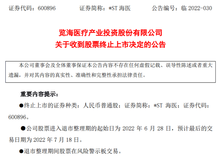 6月20日晚间,*ST海医(原股票简称览海医疗,SH600896,股价1.74元,市值18亿元)公告称,公司于同日收到上海证券交易所《关于览海医疗产业投资股份有限公司股票终止上市的决定》,上交所决定终止公司股票上市。