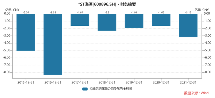 Wind数据显示,2015年以来,*ST海医扣非后归母净利润均为负值,数次游走在退市边缘。