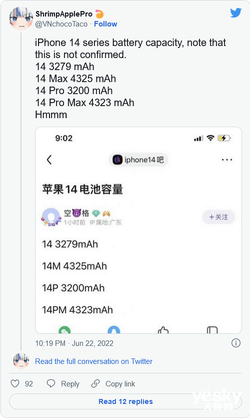 除了iPhone 14系列可能有新颜色的猜测外,最新有博主爆料iPhone14系列电池容量。