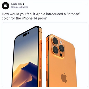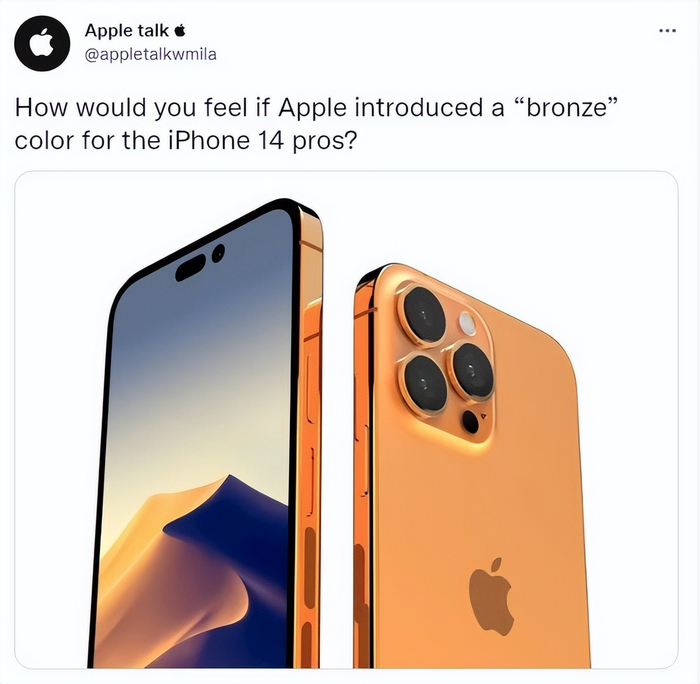 6月23日,有外国博主曝光了iPhone 14 Pro配色的渲染图,从图中可以看待iPhone 14 Pro采用古铜色配色,整体的颜色非常浓郁,饱和度很高。