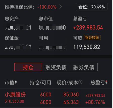 上游新闻记者采访了解到,重庆一名叫李静(应采访者要求,化名)的女性投资者最近笑惨了,随着小康股份股价不断上涨,她的两个账户(一个是平安,一个是广发)市值也在蹭蹭蹭飙升。通过与李静交谈,上游新闻记者发现她是一名职业女性,80年出生,入市不到5年,股市投资经验不丰富,但在最近一年的投资历程上颇有心得。
