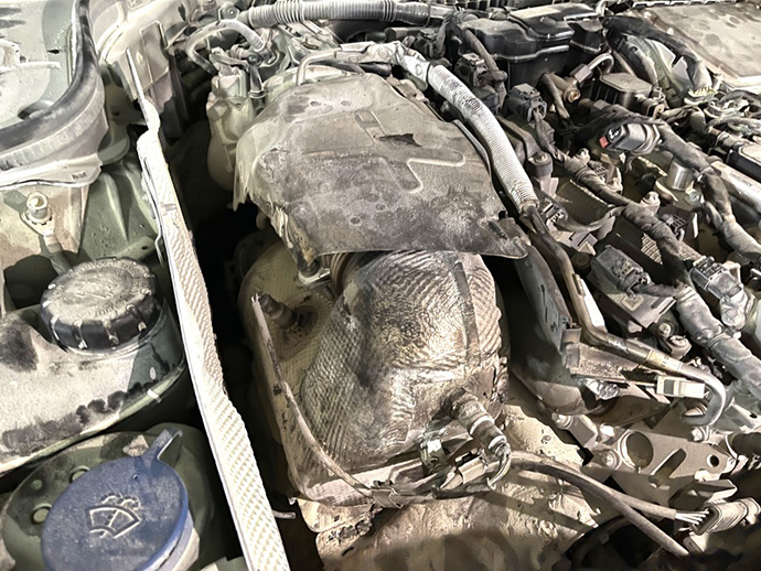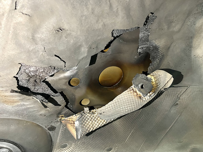 当天中午,澎湃新闻在该4S店的地下停车库看到了涉事车辆——发动机护板已被移除,发动机机舱左侧区域有明显的高温烘烤痕迹。三元催化部件上方的机舱盖内衬已被烧出一个洞,铝合金面裸露,周边内衬也如薄纸,一碰就碎。记者在现场并未闻到异味。
