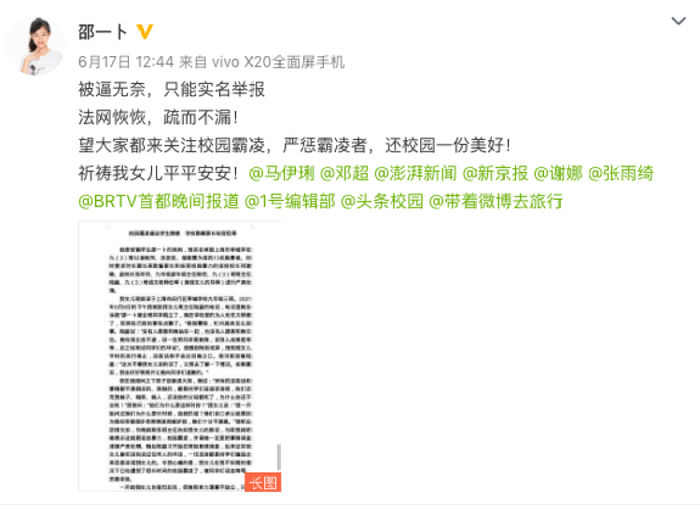 童星邵一卜因遭受校园暴力跳楼一事近日引发热议,其母亲尤永梅通过女儿的微博,实名举报参与霸凌的学生十余人,并要求严惩不作为的老师校长,为女儿讨回公道。