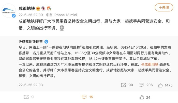 25日晚上10点,成都地铁官微“成都地铁运营”对这一事件作出回应。声明中,成都地铁称:“经核实,6月24日15:26分,视频中的女乘客携带一名儿童从天府广场站上车,15:35分至39分视频中女乘客在车厢面对同行儿童有跳舞动作,期间巡车保安按照作业流程在其他车厢巡视,15:42分该乘客携带同行儿童从金融城站下车。”