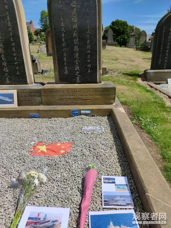 据观察者网报道,一位英国留学生,在“福建舰”下水后,于当地时间21日前往英国纽卡斯尔市圣约翰墓园的北洋水师水兵墓地。到了墓地后发现,墓碑前早已经摆满了鲜花和“福建舰”、“辽宁舰”、055型驱逐舰等照片,还有一面中国国旗。