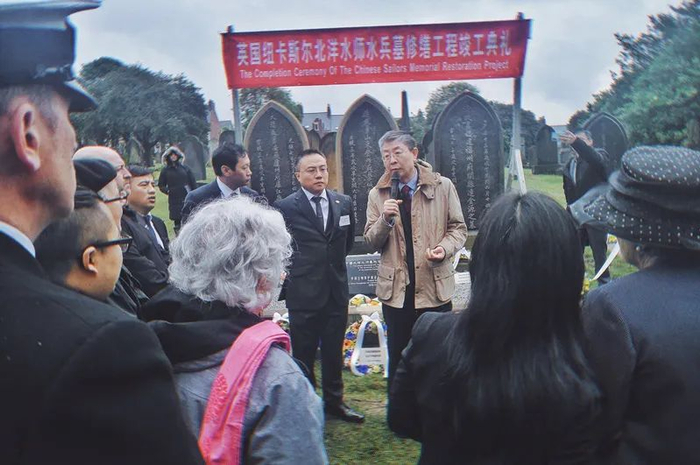 在竣工典礼上,马辉介绍了这几座墓碑的来由。1881年和1887年,清政府两次派北洋水师官兵赴纽卡斯尔接收从当地订购的军舰。5名年轻水兵(山东荣成籍袁培福,安徽庐江籍顾世忠,福建福州籍连金源、陈成魁和陈受富)不幸殉职,客死他乡。清政府将他们安葬在纽卡斯尔圣约翰墓园,并于1911年对墓地进行重修。
