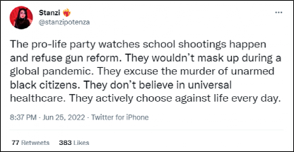 其次,上面这些话的雄辩全靠预设了反对堕胎权群体的立场,可事实上,也有不少反对持枪、支持做好防疫的美国选民在反对堕胎权,对这种在“尊重生命”上逻辑自洽的人,上面那些笼统的批评不仅显得太傲慢、轻率,也会引起这批人的反感。