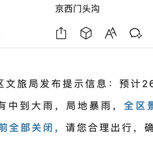 今天中午,门头沟区文旅局发布提示信息:预计26日傍晚至27日门头沟区有中到大雨,局地暴雨,全区景区、民宿、民俗户15点前全部关闭,请您合理出行,确保安全。