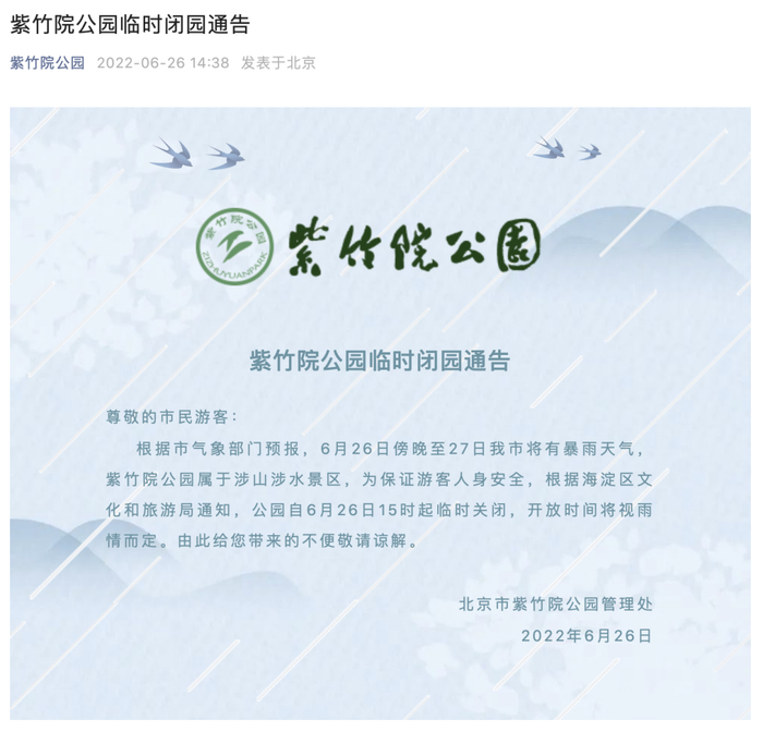 此外,多个涉山涉水景区发布临时闭园通告。