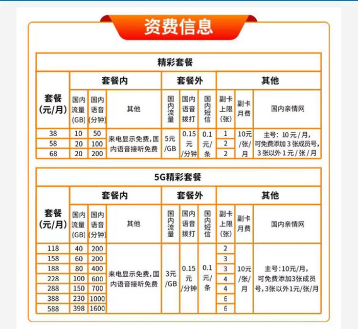 记者在官网看到,5G精彩套餐分为118元至588元七档,其中118元套餐含40GB国内流量、200分钟国内通话;158元套餐含60GB国内流量、200分钟国内通话;188元套餐含80GB国内流量、400分钟国内通话;228元套餐含100GB国内流量、600分钟国内通话;288元套餐含150GB国内流量、700分钟国内通话;388元套餐含230GB国内流量、1000分钟国内通话;588元套餐含398GB国内流量、1600分钟国内通话。