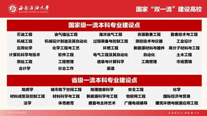 据介绍,西南石油大学的石油与天然气工程学科在全国第四轮学科评估中获评A+,并列全国第一。全国2700余所高校中,仅有80所高校拥有A+学科,西南石油大学就在此列。学科对应的本科专业有石油工程、油气储运工程、海洋油气工程。学校的工程学、化学、材料科学、地球科学学科也位列世界高水平行列。学校现有43个一流本科专业建设点,其中国家级28个、省级15个,涵盖了石油天然气、机械、地质、化工、材料、计算机、电子信息、土木、经济管理、社会工作、外语等领域。