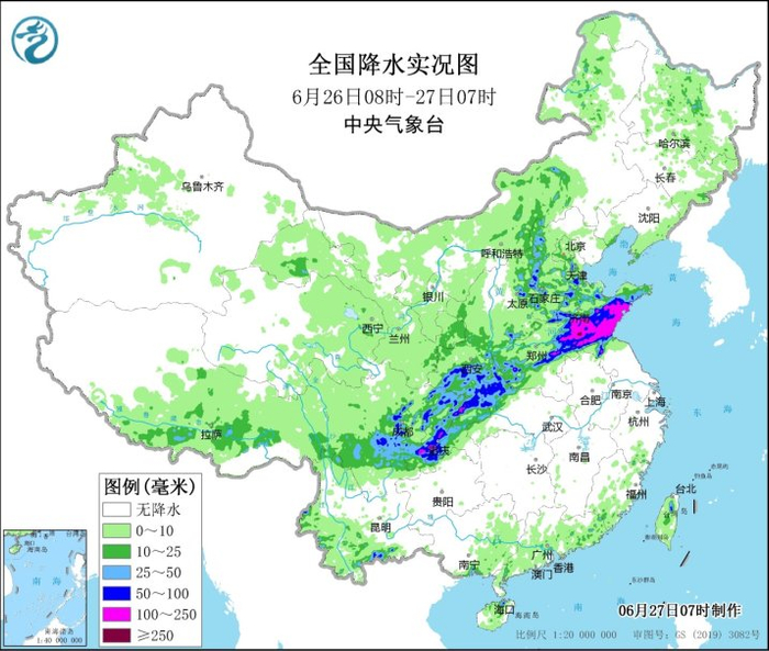 26日,我国降水发展增强,在四川盆地至黄淮一带出现了强降雨,气象监测显示,四川盆地、陕西南部、湖北西北部、河南西南部和东部、山西南部和东部、河北中南部、天津南部、山东、江苏北部等地出现大雨到暴雨,四川盆地、湖北西北部、陕西南部、河南东部、山东中南部、江苏北部等地部分地区出现大暴雨,山东济宁、枣庄、日照、潍坊等局地特大暴雨(250~371.5毫米)。