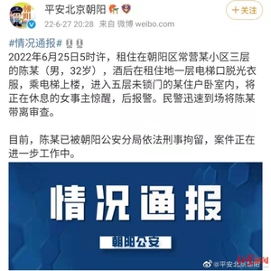 6月27日晚,北京市公安局朝阳分局通过官方微博“平安北京朝阳”,通报了德云社前艺人陈霄华所涉案件最新情况。通报称,陈某(男,32岁),酒后在租住地一层电梯口脱光衣服,乘电梯上楼,进入五层未锁门的某住户卧室内,将正在休息的女事主惊醒,后报警。目前,陈某已被朝阳公安分局依法刑事拘留,案件正在进一步工作中。