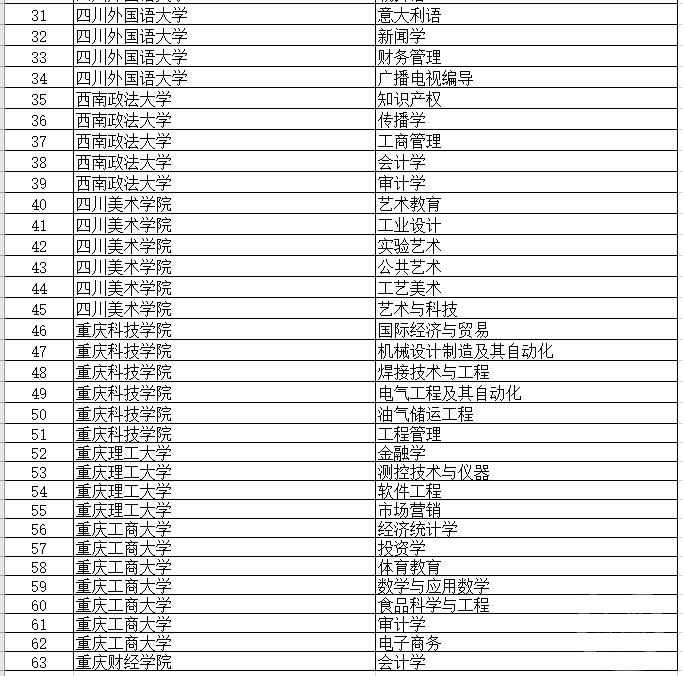 此外,我市高校入选国家级一流本科专业建设点的还包括:重庆邮电大学有3个专业、重庆交通大学有8个、重庆医科大学6个、重庆师范大学2个、重庆文理学院5个、长江师范学院3个、四川外国语大学7个、西南政法大学5个、四川美术学院6个、重庆科技学院6个、重庆理工大学4个、重庆工商大学7个及重庆财经学院1个。