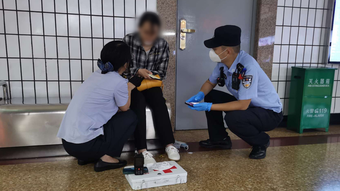 6月16日上午9时,四惠站派出所民警殷亚洲、马恺,在地铁1号线国贸站巡逻时,在站台座椅上发现一名女子脸色苍白,用纸巾捂着下颚。
