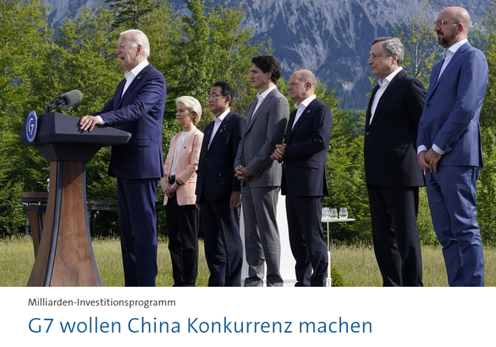 峰会首日,七国即宣称,将在未来5年内筹集6000亿美元,为发展中国家提供基础设施建设资金。德国媒体普遍称,这是西方对抗中国“一带一路”倡议的战略计划。