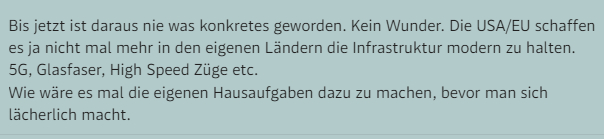 在奥地利媒体standard的报道中,有网友评论称:“到目前为止还没有任何具体进展。这也不奇怪。美国和欧洲连自己国家都没有建好现代化的基础设施,比如5G,光纤,高铁等。在推出这种搞笑计划之前,先做好自己家的事不行吗?”