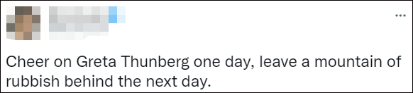 据每日邮报当地时间27日报道,“环保少女”格蕾塔·通贝里曾“空降”音乐节做环保演讲,现场掌声雷动,结果音乐节结束后,现场垃圾如山,那些为他鼓掌的人们将废弃的纸杯、食品盒子、拖鞋、充气帐篷、电子烟扔得遍地都是。众多网民质疑这些参加活动的观众太过“伪善”。