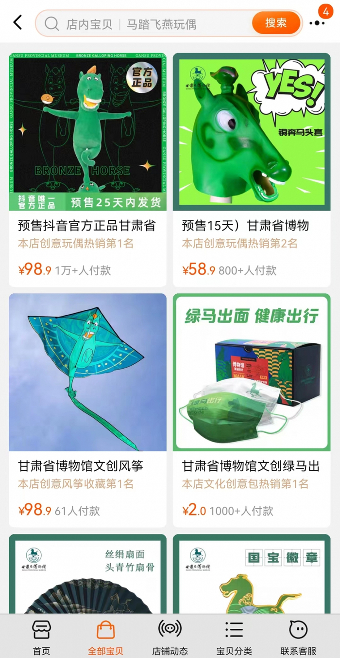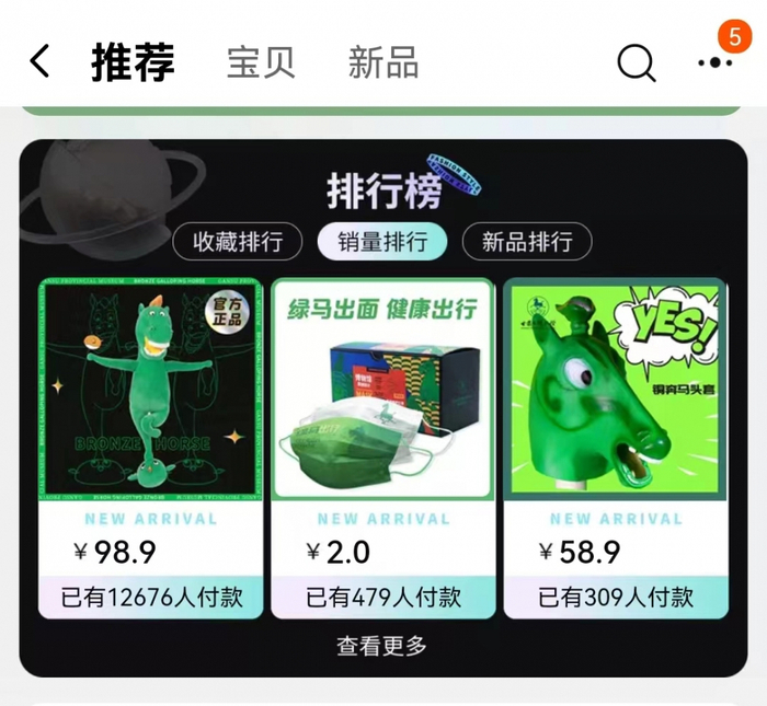 俗话说:“官方整活最为致命。”最近由甘肃省博物馆官方推出的马踏飞燕玩偶火了——这个由一匹憨态可掬的绿马踩在呆萌龙雀背上组成的玩偶,线上、线下全部售罄,月销量突破1万,甘肃省博物馆的淘宝官方旗舰店打出了公告《疯狂踩缝纫机中 国宝值得等待》。