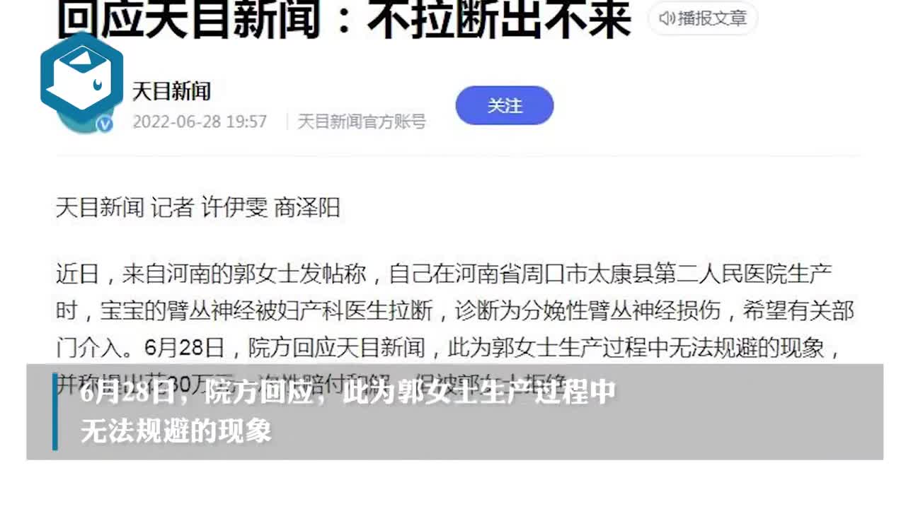 近日,来自河南的郭女士发帖称,自己在河南省周口市太康县第二人民医院生产时,宝宝的臂丛神经被妇产科医生拉断,诊断为分娩性臂丛神经损伤,希望有关部门介入。6月28日,院方回应天目新闻,此为郭女士生产过程中无法规避的现象,并称提出花30万元一次性赔付和解,但被郭女士拒绝。