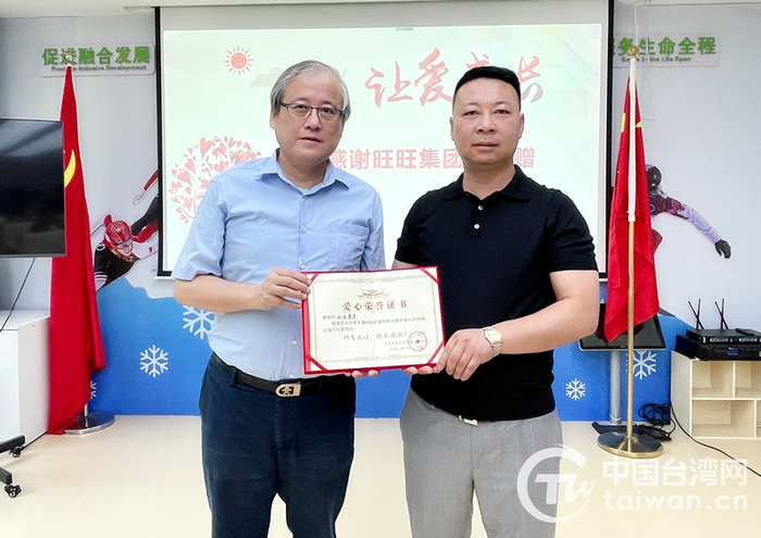 通州启渡残疾人服务中心创办人郭文龙(左)向旺旺集团北京首席代表、全国台企联常务副会长林天良颁发《爱心荣誉证书》。(中国台湾网发)