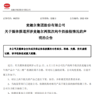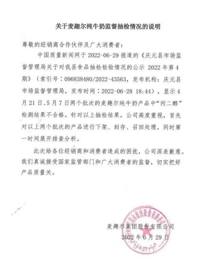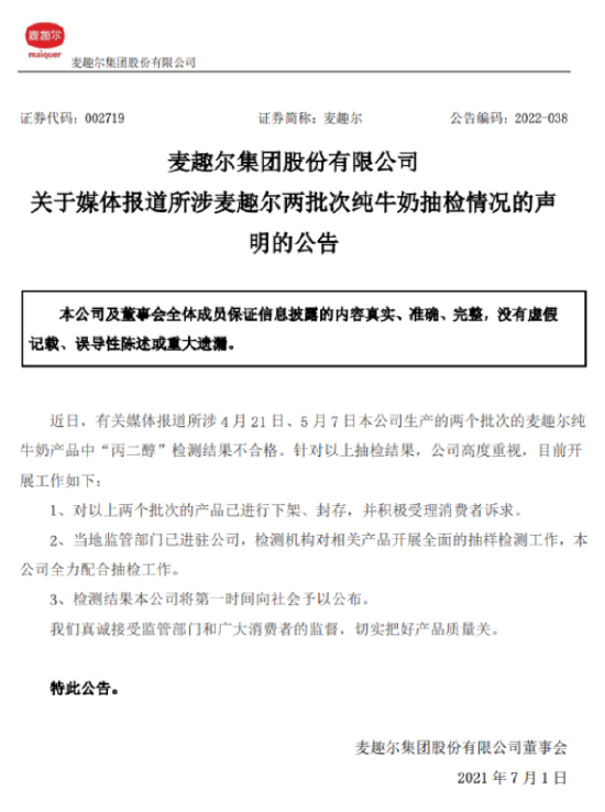 麦趣尔6月30日公告,近日,有关媒体报道所涉4月21日、5月7日本公司生产的两个批次的麦趣尔纯牛奶产品中“丙二醇”检测结果不合格。针对以上抽检结果,公司高度重视,目前开展工作如下:对以上两个批次的产品已进行下架、封存,并积极受理消费者诉求;当地监管部门已进驻公司,检测机构对相关产品开展全面的抽样检测工作,本公司全力配合抽检工作;检测结果本公司将第一时间向社会予以公布。