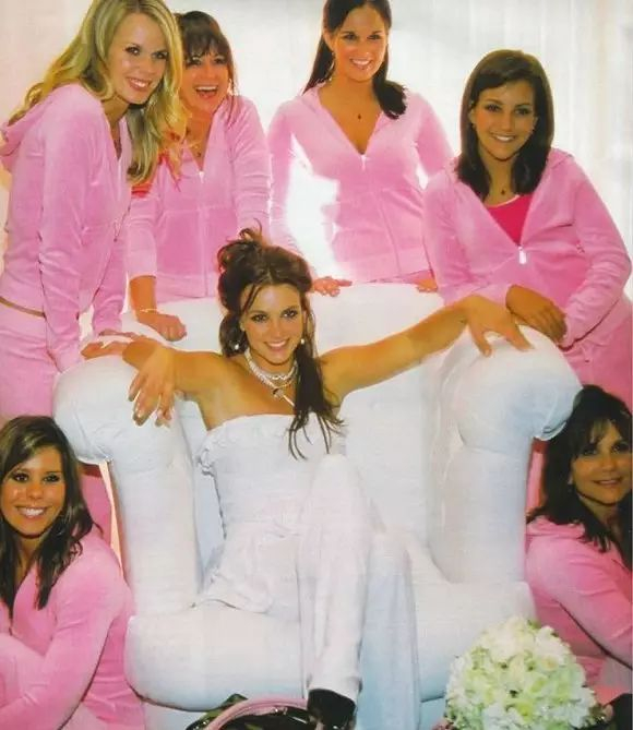 天鹅绒运动套装的鼎盛时期少不了小报文化的推波助澜。那是前社交媒体时代,被丑闻主宰的八卦小报和网站,不断抛出与名人私生活有关的花边新闻。好莱坞“坏女孩俱乐部”和一线明星们出现在头版时,都穿着五彩缤纷的天鹅绒运动套装。就像2004年,“小甜甜”布兰妮下嫁给伴舞凯文·费德林的新娘派对上,这位任性的新娘被穿着粉色天鹅绒运动套装的伴娘团簇拥着。好莱坞名媛们的私密约会也经常被拍到穿着同类套装。