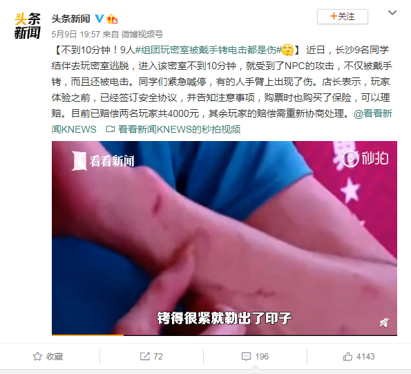 去年,长沙9名同学结伴去玩密室逃脱,就在游戏过程中就受到了NPC(非玩家角色,工作人员扮演)的攻击,不仅被戴手铐,而且还被电击。