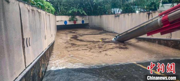 中新网三亚7月2日电 (莫文彬)台风“暹芭”给三亚带来持续降雨,城区一小区车库雨水倒灌积水近两米,三亚消防出动“龙吸水”大功率城市排涝车进行排涝。
