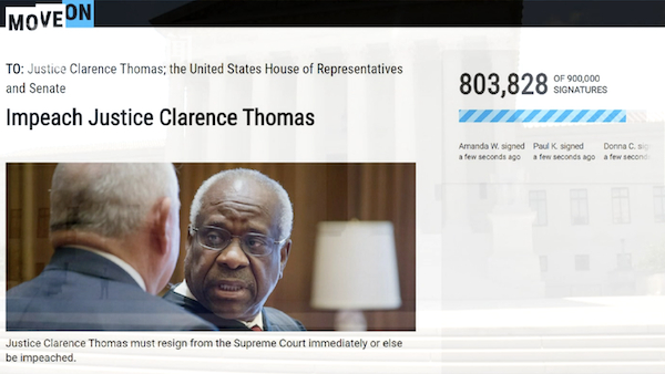 这项请愿行动由一家自由派团体发起。请愿书中指出,克拉伦斯·托马斯认为堕胎权在美国宪法中并不存在,未来他还将推动推翻确立避孕等权利的释宪判例。