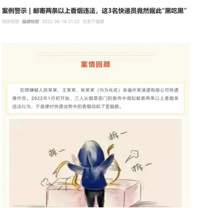 近日,福建省检察院微信公众号公布了一起专偷超量香烟的案件:福州某快递公司的三名快递操作员从烟草部门宣传中得知快递两条以上的香烟可能涉嫌违法后,利用工作的便利,分工配合6次盗窃超量香烟。