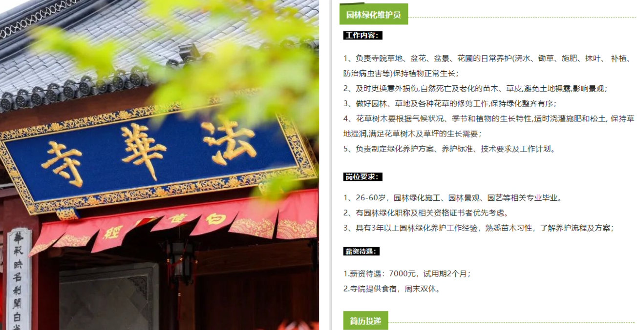 厨师要求60岁以下,限男性,负责寺院早、中、晚三餐,待遇包吃住,做六休一,薪资8000元/月。园林绿化维护员负责寺院草地、盆花、盆景、花圃的日常养护等,要求26-60岁,园林绿化施工、园林景观、园艺等相关专业毕业,入职薪资7000元/月,寺院提供食宿,周末双休。