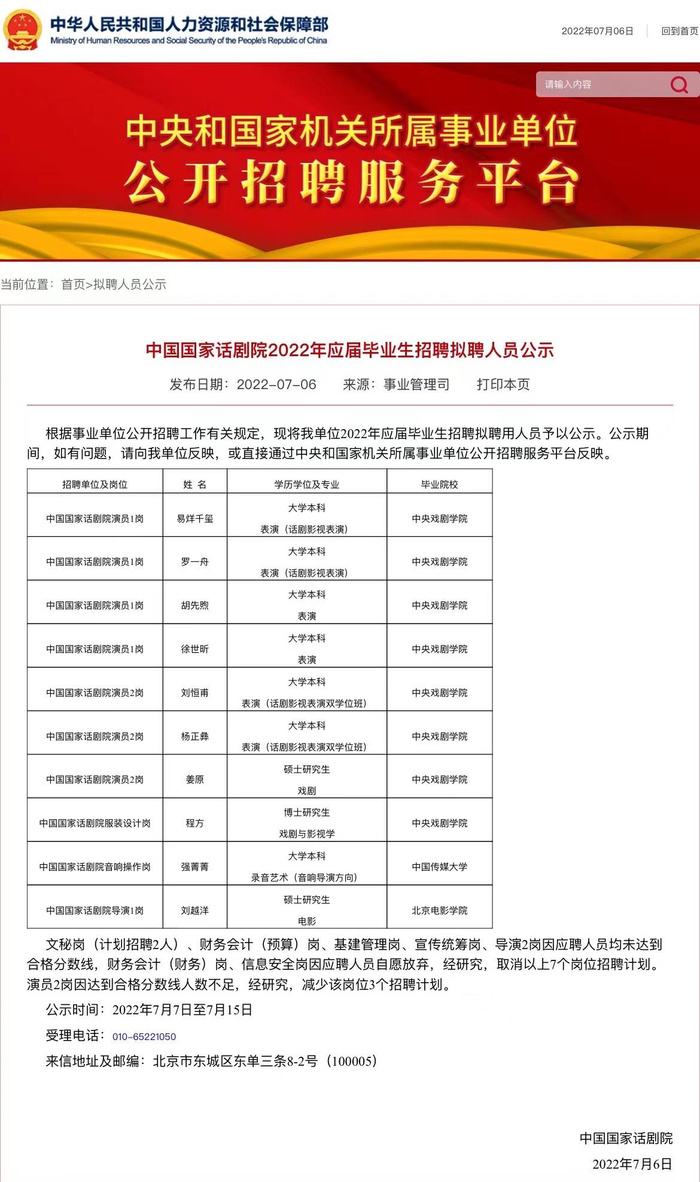 新京报讯 7月6日,中华人民共和国人力资源和社会保障部发布《中国国家话剧院2022年应届毕业生招聘拟聘人员公示》,公示显示,中央戏剧学院毕业的易烊千玺、罗一舟、胡先煦等7位本科、硕士应届毕业生成中国国家话剧院演员岗拟聘人员。