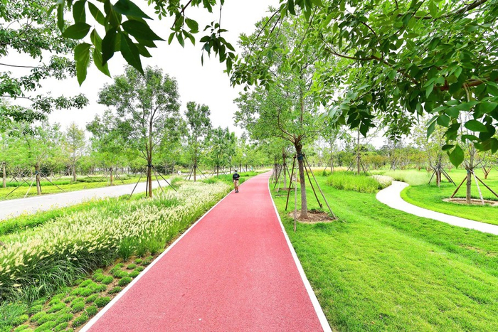 绿心森林公园是一座融合了24节气传统文化、地域文化、森林文化和生态文化的城市公园。长5.5公里的动感活力环路构成“人”字抽象形“五角星”,沿着这颗星建有8米宽的骑行道和3米宽的漫步道。