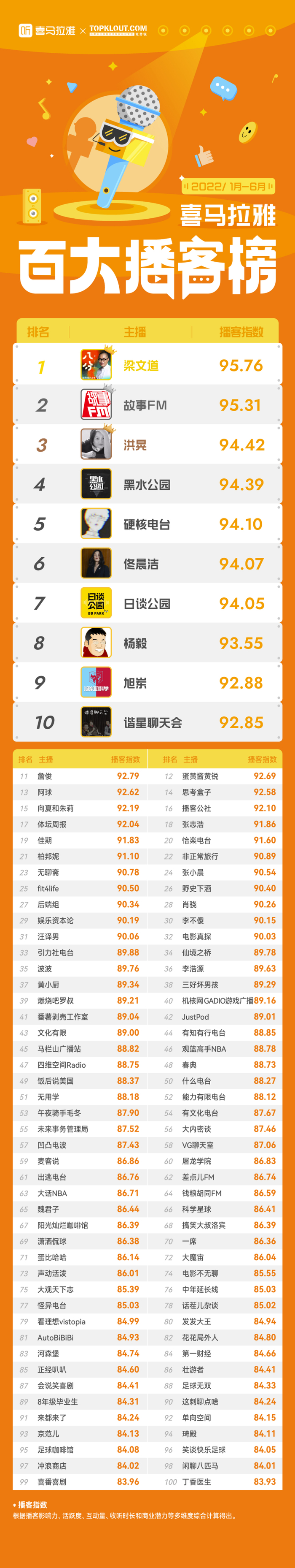 喜马拉雅联合克劳锐发布2022年上半年“百大播客榜”,播客创作者生态蓬勃多元