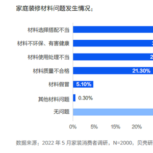 近日,贝壳研究院调研2000位家装消费者,发布了《2022家装消费趋势调查报告》。报告盘点了“装修材料”“装修工艺”“计划外增项”等集中暴露的五大消费痛点,其中,近六成受访者家装遭遇材料问题。