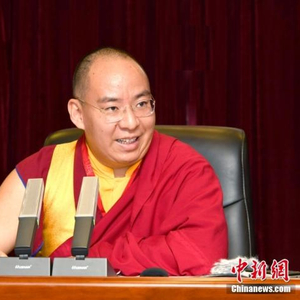 7月7日,热振寺热振•洛追嘉措•赤列伦珠活佛在座谈会上发言。 中新社发 李林 摄