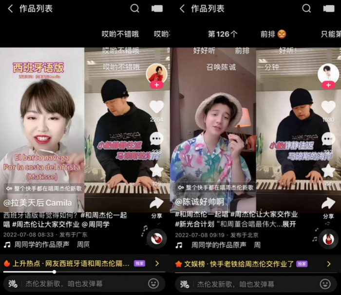 两天之后,周杰伦果然信守诺言,7月8日上午8点,周杰伦在快手平台发布了一条钢琴伴奏的短视频。视频中,周杰伦亲自弹钢琴进行伴奏,邀请网友合拍跟唱,用亲密合作的互动形式邀请快手网友一起演绎《最伟大的作品》这首新歌。这条短视频发布之后,点赞量迅速突破百万大关,视频评论区也相当热闹,不少杰迷跃跃欲试。 @拉美天后Camila、@桑娜_、@朱思思Jesse、@秋陌Cheyenne、@陈诚好帅啊等快手音乐达人纷纷响应,和周杰伦合拍视频一展歌喉,并将自己的风格融入《最伟大的作品》,@拉美天后Camila甚至用西班牙语演绎了一番,赋予《最伟大的作品》别样的听觉感受。