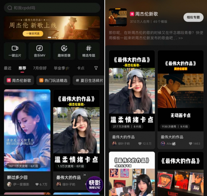 快手旗下的官方剪辑神器快影App也第一时间上线“周杰伦新歌”专题内容,专题集合了周杰伦热门新歌、经典老歌的各式模板玩法,包括《最伟大的作品》新歌情绪卡点、歌词背景界面等模板玩法,《说好不哭》《等你下课》等经典老歌的剪辑框界面、生活记录卡点等模板玩法。丰富多样的新歌视频模板,简单好操作,让你秒变周杰伦新歌mv主角。截止至7月7日,快影共上线584个周杰伦的歌系列玩法模板,其中新歌《最伟大的作品》上线212个。周杰伦系列快影模板使用量达73.8万,斩获2次快手热榜,最高榜位达top10。