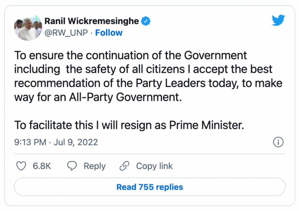 斯里兰卡总理办公室当天早些时候发表声明说,总理维克拉马辛哈愿意辞职,以利于组建各党派参与的新政府。维克拉马辛哈随后在社交媒体上称: