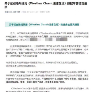 中新网7月10日电 中国社会科学院大学图书馆近日发布通报称,由于该校读者违规使用《Westlaw Classic法律在线》数据库,该校接到数据库商的通报,学校IP受到该数据库商永久封禁,影响数据库的正常使用。