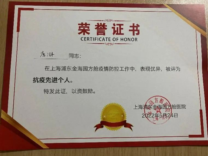 5月25日, 唐淋服务的方舱医院关舱,他本人也获得了“抗疫先进个人”称号。
