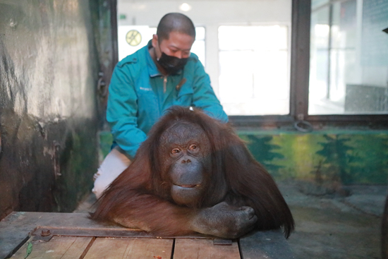 红毛猩猩“胖胖”从2008年起下肢瘫痪,兽医院和饲养员一直没有放弃对它的治疗和护理,动物园也未把它从原来的场馆搬离。游人可以看到“胖胖”在“床上”卧着、躺着,或在伸手拉吊环。