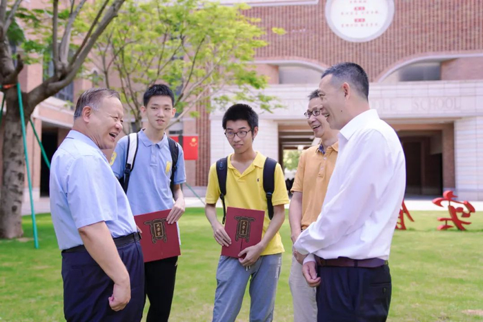 深圳中学校长朱华伟、张继平院士、冯晨旭、彭也博、冯晨旭的父亲、彭也博的父亲(从左至右)