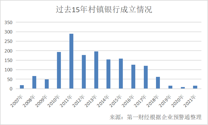 从成立时间上看,2011年是村镇银行设立最多的年份,达286家。当年,原银监会下发《商业银行村镇银行子银行管理暂行办法》(下称《暂行办法》)的征求意见稿,提出村镇银行子银行模式,以应对发展阶段村镇银行设立数量不达标的情况。《暂行办法》支持符合条件的银行批量化发起设立村镇银行,要求主发起人总资产不少于1000亿元人民币,且子银行需对村镇银行进行绝对控股。不过,《暂行办法》至今未有进展。