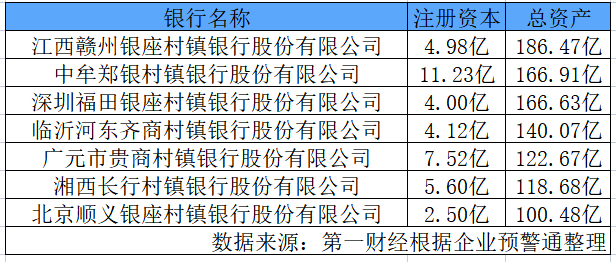 在总资本方面,据不完全统计,截至目前,总资产超百亿元的村镇银行有7家,分布在不同地区,分别为北京顺义银座村镇银行股份有限公司、湘西长行村镇银行股份有限公司、广元市贵商村镇银行股份有限公司、临沂河东齐商村镇银行股份有限公司、深圳福田银座村镇银行股份有限公司、中牟郑银村镇银行股份有限公司和江西赣州银座村镇银行股份有限公司。总资产在亿元以上的村镇银行则超910家,但并非以上所有村镇银行都在盈利。