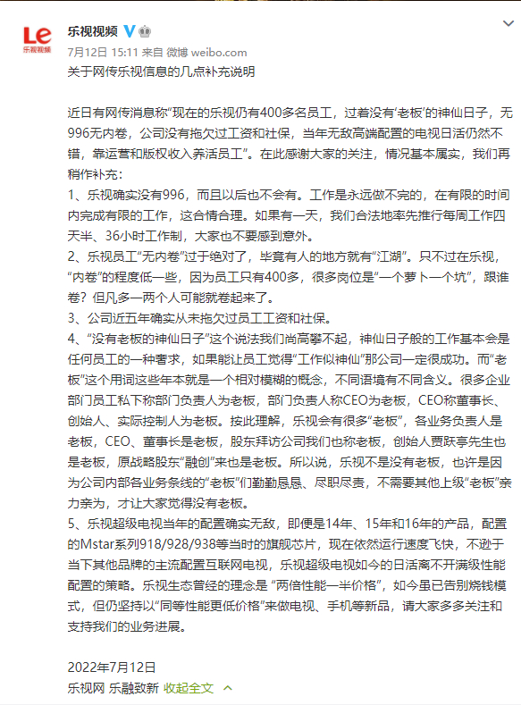 近日有网传消息称“乐视员工过着没有老板的神仙日子”,7月12日,乐视官方微博回应了:情况基本属实。乐视在声明中做了几点补充说明: