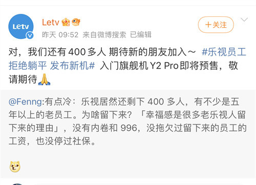 在7月11日,乐视的官方微博账号@Letv转发了这条微博,并且回复称:“对,我们还有400多人,期待新的朋友加入。”而且还很敬业地宣传了一下“入门旗舰机Y2 Pro即将预售”的消息,并称:“乐视都还在坚持做手机,你有什么理由不努力?”